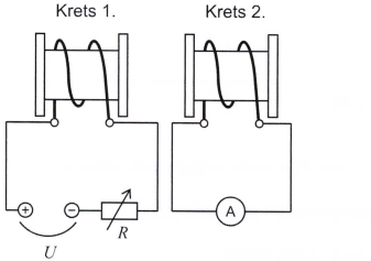 Två likadana spolar är placerade intill varandra som figuren nedan visar. Med hjälp av vridmotståndet R kan strömmen genom spole 1 regleras.