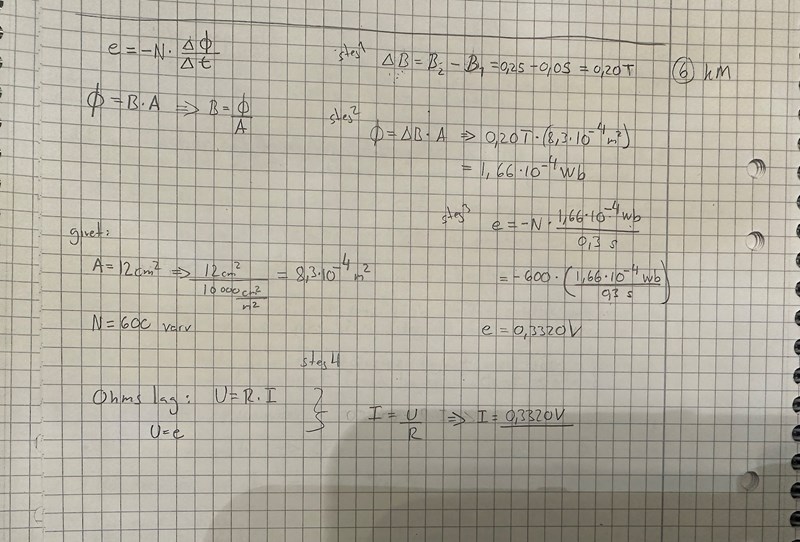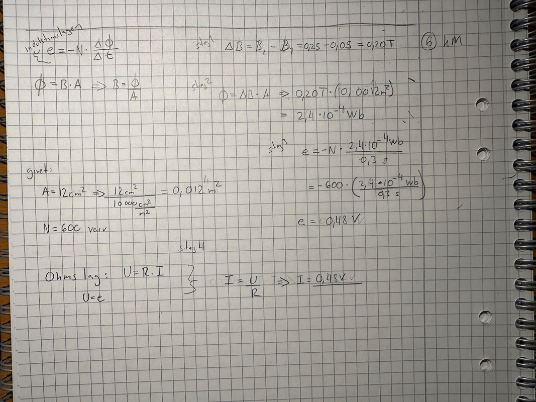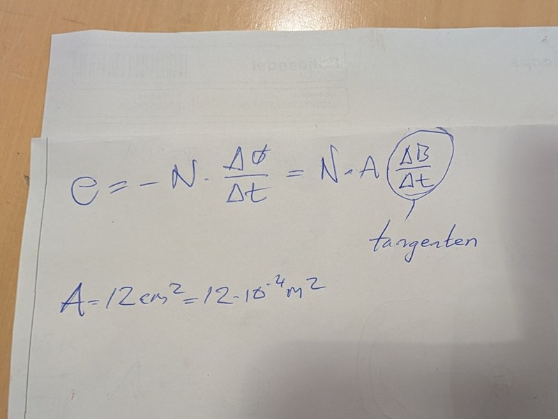 En spole med tvärsnittsarean 12 cm² innehåller 600 lindningsvarv. Dess resistans uppgår till 11 Ω. Till spolens ändpunkter har anslutits ett instrument för mätning av ström. Resistansen i detta mätinstrument uppgår till 2,0 Ω. Spolen är placerad i ett magnetfält så att magnetfältet, som är homogent, går vinkelrätt mot spolens tvärsnittsyta. Flödestätheten i spolen varierar med tiden enligt nedanstående diagram.