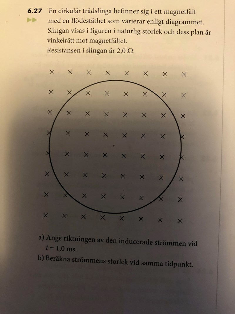 Här är uppgiften, men det tillkommer även ett diagram av flödestätheten som en funktion av tiden. Det jag behöver hjälp med är b-frågan. Jag har ställt upp att den inducerade spänningen i slingan är lika med tidsderivatan av B multiplicerat med Arean av cirkeln. Det är här det sedan blir fel, jag tänkte att man skulle ta arean av slingan som ser magnetfältet för A. Men enligt facit blir det endast rätt svar om man tar arean av ytan mellan slingan alltså vanliga (pi)r^2. Varför är det såhär? Alltså varför tar man inte arean av slingan som skär flödeslinjerna?