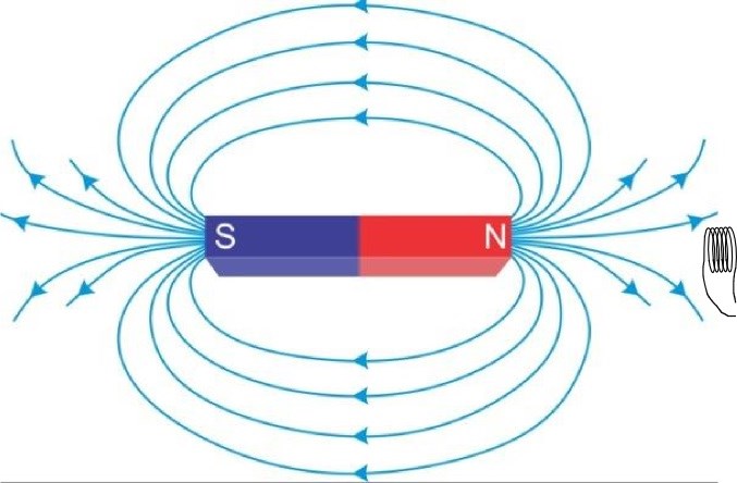 Till höger i bilden finns en liten spole. Om den flyttas längre åt höger så kommer den att känna av ett svagare magnetfält.