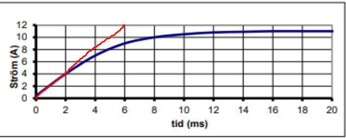 Efter en viss tid har strömmen stabiliserat sig till 11 A och får då resistansen genom ohms lag.