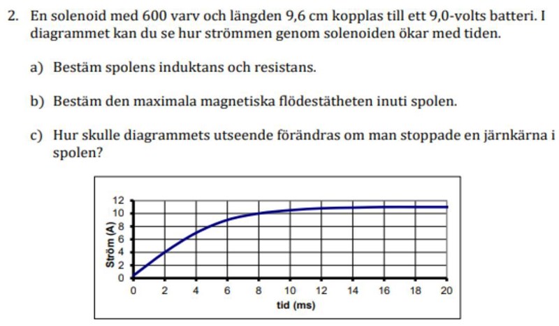 c) Jag tänker att grafen blir planare i början då järnkärnan kommer öka spolens induktans och därav kommer det ta längre tid för växelströmmen att stabilisera sig. Däremot bör strömmen stabilisera sig på samma Amper-nivå efter ett tag då strömmens storlek endast begränsas av resistansen.