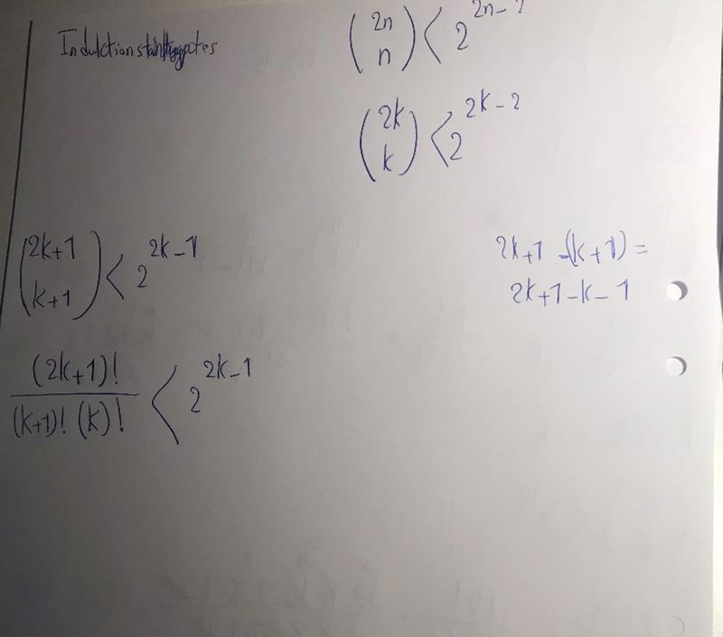 Hej! Jag behöver hjälp med denna uppgift. Jag tror att jag ska använda induktion (basfall, induktionssteg ) för att bevisa om detta uttryck stämmer. Men jag vet inte hur jag ska göra när det kommer till kombinatorik. Jag blir tacksam om någon hjälper! :)