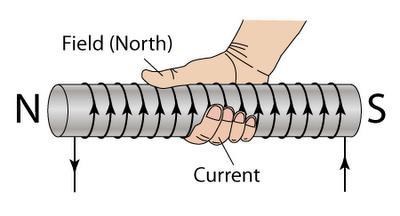 Strömmen går i fingrarnas riktning. Magnetfältet går då i tummens riktning i spolen.