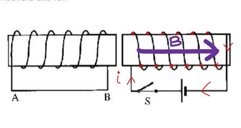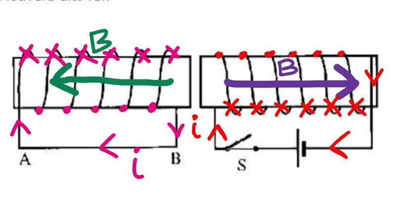 Om det blir ström från A till B eller tvärtom beror på hur spolen är lindad. I det här fallet så går krysströmen längst upp till höger mot B och kommer inte från B.