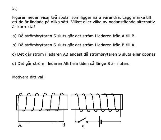 Har jättesvårt för uppgifter som denna. Hur ska jag tänka? Tänker att c måste vara rätt eftersom det krävs en förändring i magnetfältet för att en ström ska induceras i den vänstra spolen. Men vet inte vilken av a eller b som är rätt?