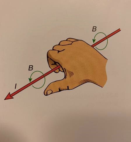 Med höger tumme längs B så går strömmen i fingrarnas riktning. Det blir då krysströmmar upptill i bilden och prickströmmar nertill.