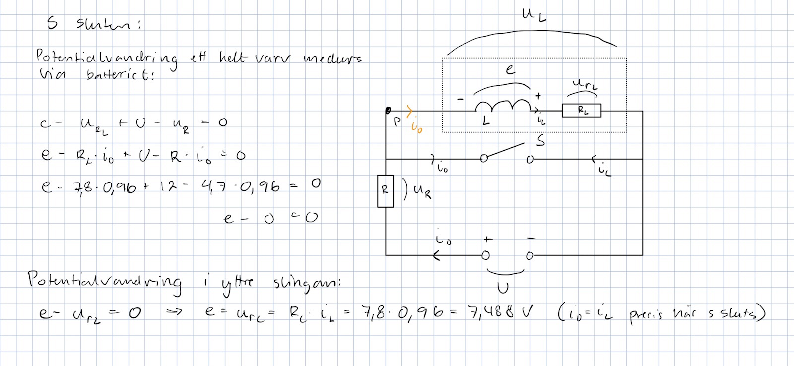 Vi har samtidigt lärt oss att strömmen inte omedelbart kan ändras. Så egentligen borde väl det inte hunnit flyta någon ström genom brytaren vilket innebär att den orangemarkerade strömmen är korrekt men att det inte finns någon iL heller? För om allt är som innan brytaren stängdes, borde min första potentialvandring vara rätt och den andra felaktig?