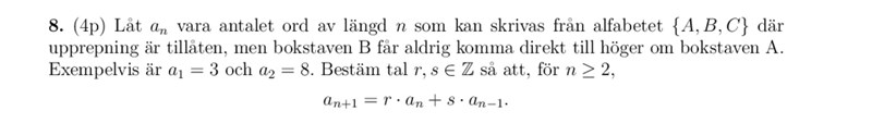 Smutsmunnen skrev:Hej för n=1 så beräknas a_1 enklast med uppräkning. Det finns tre ord av längd 1, A, B och C. Alltså har vi a_1=3. Klart.