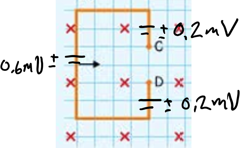 På samma sätt blir den inducerade spänningen på de kortare ledningarna, 0.2mV, med den högre potentialen uppåt. Då kan man räkna ihop spänningarna (med tecken) från C till D.