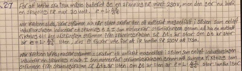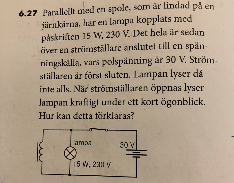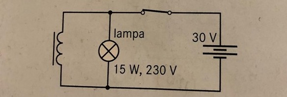 Glödlampan, som är tänkt för 230 V nätspänning, har en resistans på ungefär 4 kΩ. Spolen har en mycket lägre resistans och följaktligen en mycket större likström än lampan. Likströmmen i spolen gör att det då finns lagrad energi i den, då brytaren bryter strömmen från spänningskällan.