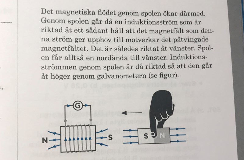 jag är med på frågan i helhet gällande alternativ osv men blir förvirrad av svaret i facit gällande magnetfältets riktning i spolen som har N och S på vänster/höger sida