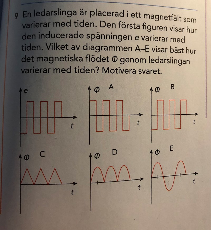 Kan någon förklara hur man ska tänka. Jag förstår att den inducerade spänningen är derivatan på flödet med avseende på tiden, då borde ju grafen man ska få fram vara den primitiva funktionen. Svaret blir hursomhelst C, och jag förstår inte riktigt varför