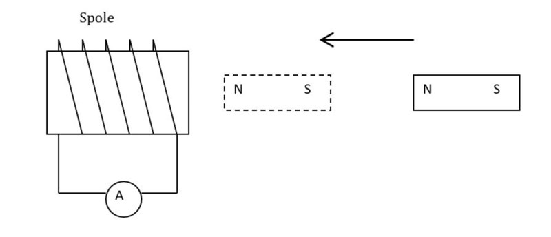 e) Då en stavmagnet närmar sig en spole (så som figuren nedan visar) ökar det magnetiska flödet i spolen och en ström induceras. Åt vilket håll är strömmen genom amperemetern riktad (åt höger eller åt vänster i figuren)? Motivera ditt resonemang utförligt.