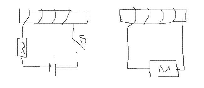 Men hur kan strömmen minska när S öppnas? Det är en strömbrytare ju? Utan den finns ingen ström i vänstra spolen och när den öppnas börjar det gå ström?