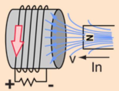 Fältlinjerna hos magnetfältet i en stavmagnet är riktat som i figuren, löper från nordänden till sydänden utanför magneten. Det gör att om man för magneten med nordänden först in mot spolen från vänster som i bilden, så: