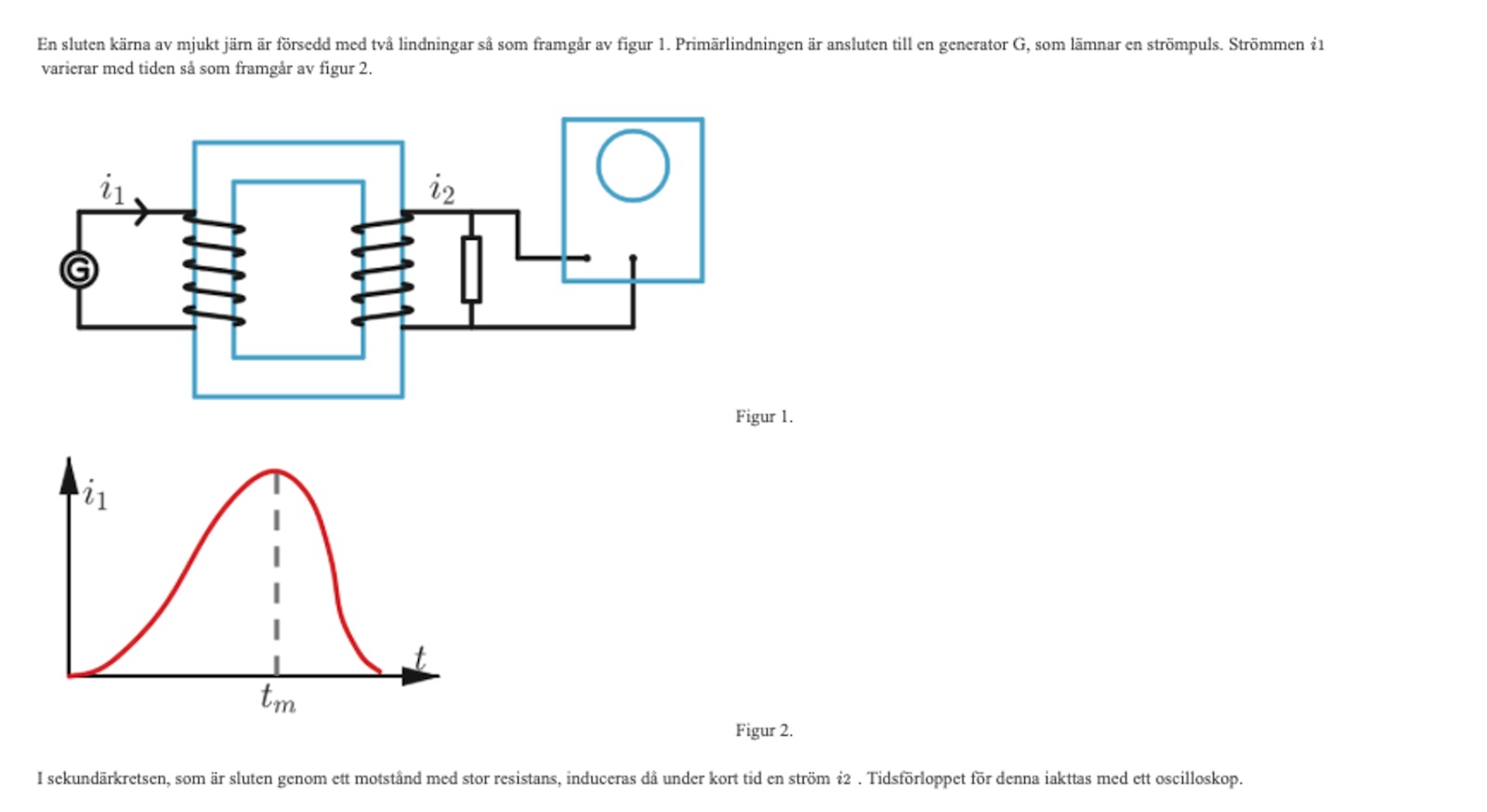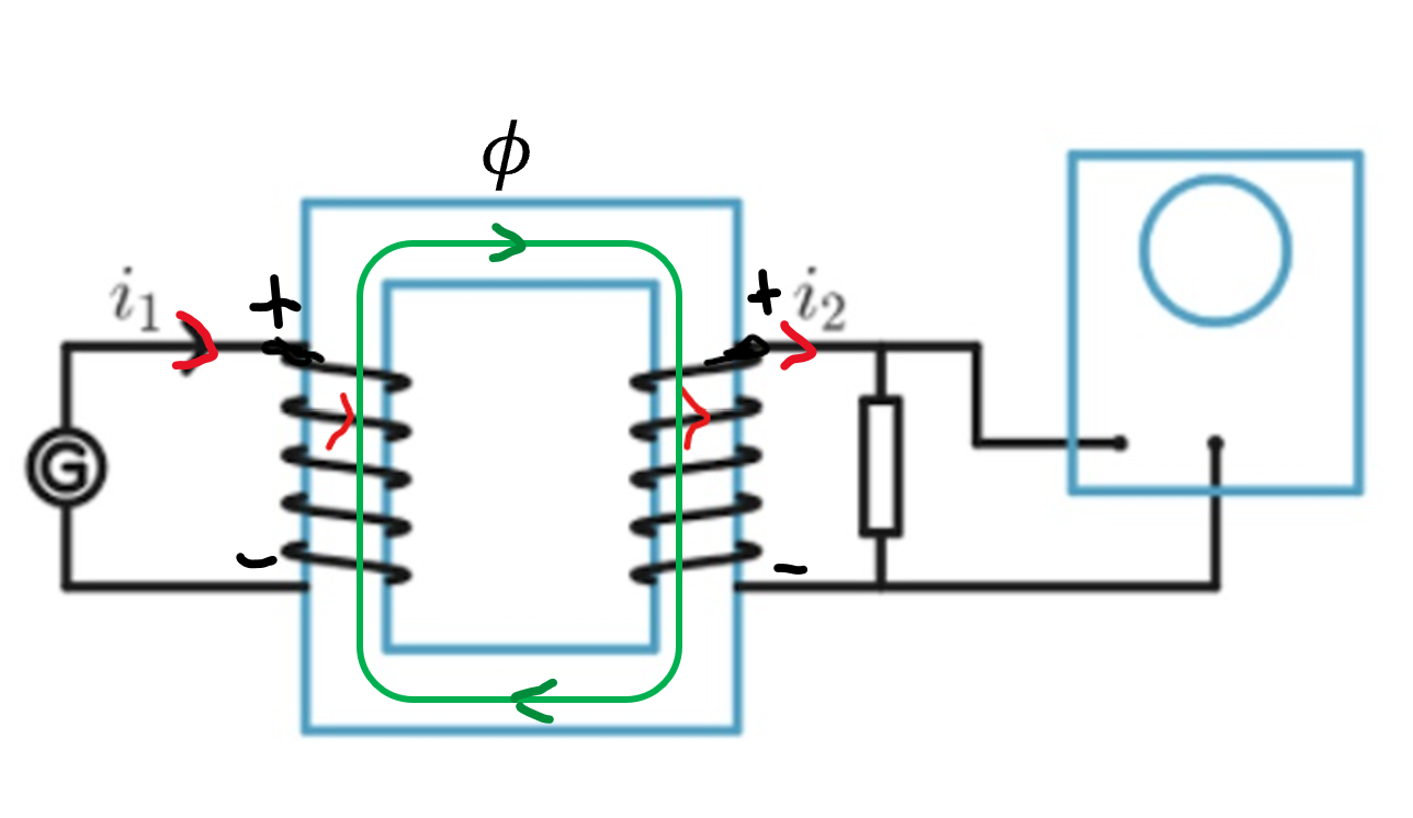 Strömmen genom spole 1 (ansluten till generatorn) skapar ett magnetfält riktad nedåt uppåt i spole 1 enl. högerhandsregeln (se figur). Samma magnetfält går igenom spole 2. Förändringen i strömmen i1 med avseende på tiden är proportionell mot förändringen i magnetisk flödestäthet genom spole 2.