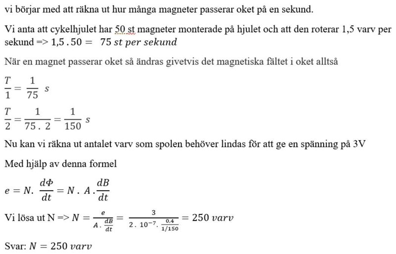 som ger oss att f är 1,5*50 då så många magneter passerar oken per sekund, och vi kan lösa ut T till ungefär 0,01333, som vi sedan dividerar med 2 = 0,006667. Sätter vi in detta nu i den första formeln får vi 250 varv = N. Hoppas detta hjälpte lite iallafall!