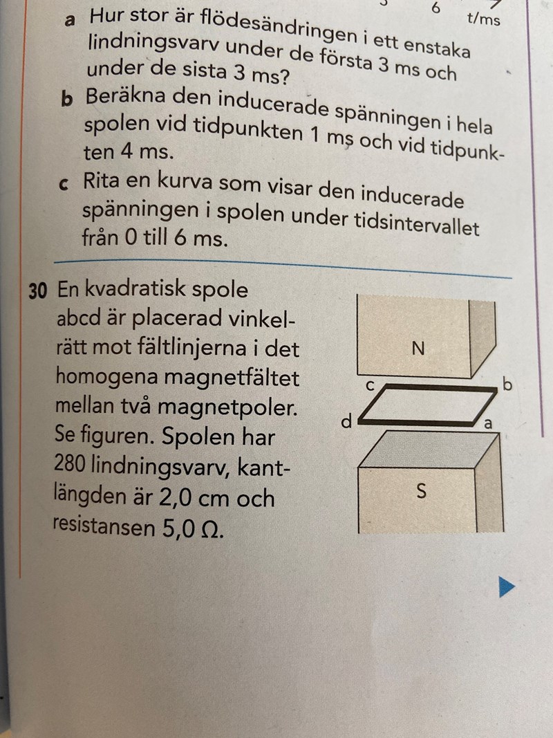 Hej! Jag förstår inte hur jag ska veta strömriktningen på denna uppgift. Jag tänkte att magnetfältet mellan magneterna tvingar på ett magnetfält ner och då vill spolen motverka detta med upp. Högerhandsregeln - tumme upp och strömmen blir blir från punkt a till B till c till d till a. Men facit säger att det blir åt motsatt håll, alltså adcba. Jag förstår inte varför.