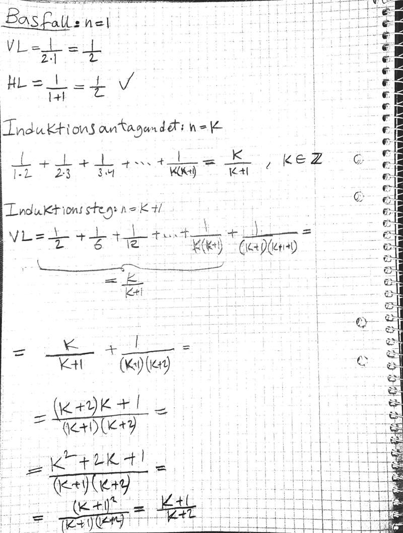 Uppgiften: 11·2+12·3+13·4+...+1n(n+1)=nn+1\displaystyle \frac {1}{1 \cdot 2} + \frac {1}{2 \cdot 3} + \frac {1}{3 \cdot 4} +...+ \frac {1}{n(n+1)} = \frac {n}{n+1}