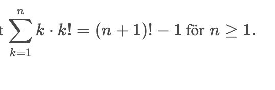 hej, behöver hjälp med följande uppgift. Jag har löst den precis som facit fram till det tredje steget då man ska sätta ut n=p+1. Jag förstår inte hur man kan göra om (p+1)!-1 + (p+1)(p+1)!-1 till (p+1+1)!-1. Har det något att göra med Pascals triangel eller är jag ute och cyklar.....?