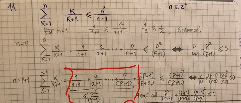 Det du byter är 1/(1+1)+2/(2+1)+….p/(p+1) mot p2/(p+1) vilket är tillåtet enligt induktionsantagandet. Till detta lägger du nästa term som är (p+1)/(p+2). Därefter förenklar du för att visa påståendet.