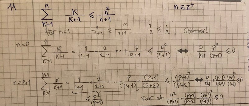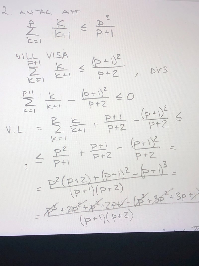 Jag fortsätter sen med att visa olikheten som jag skrivit längst ner till höger. Då får jag -p/(p+1)(p+2) _< 0, dvs VL _< HL. VSV.