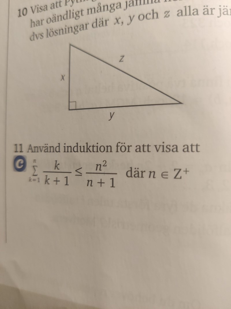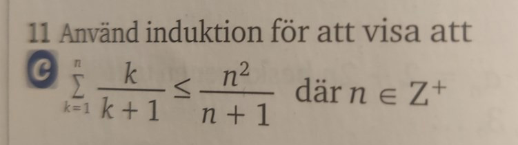 Jag förstår inte riktigt hur jag kan applicera induktionsbevismetoden i en olikhet. Tex denna uppgift: (11)