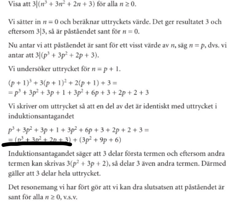 Precis! Vi har antagit att 3 är en delare till polynomet, vilket vi sedan använder för att bevisa att det är sant för (n + 1).