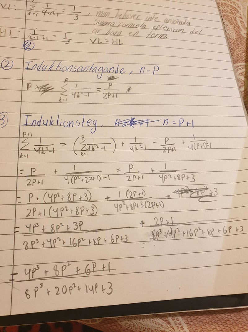 basfallet har du fixat, så vi antar att likheten gäller till p, alltså nu vill vi vissa att detta gäller för p+1. ifall vi nu kan vissa att detta är samma sak som är vi färdiga.