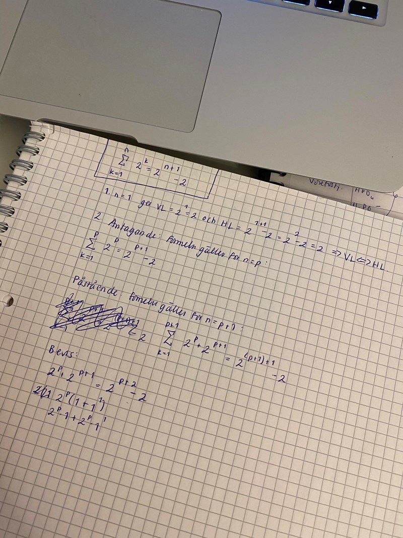 förstår inte varför du har ytterligare en term där 2^p+1, är inte sista steget bara att man ersätter n med p+1? Varför ska jag då lägga till 2^p+1 när jag redan har 2^p+1 -2?