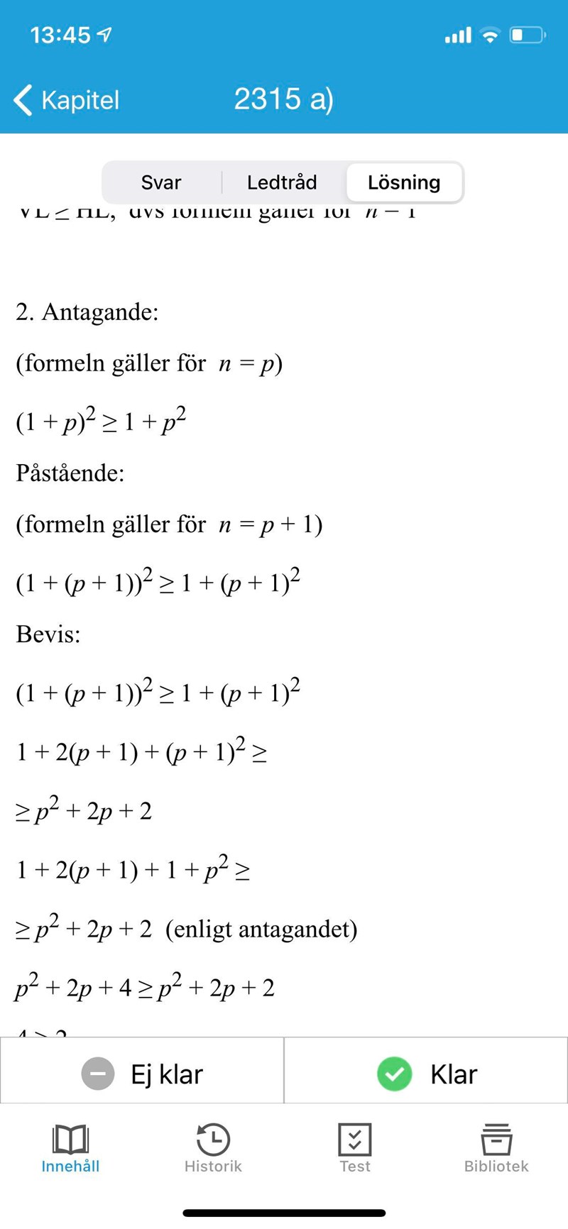 Första steget är att använda kvadreringsregeln på (1+(p+1))2 så att du kan "få loss" (p+1)2 = (1+p)2. Då kan du använda dig av induktionsantagandet, att så att du kan förenkla det och få fram ett uttryck som är större än HL = .