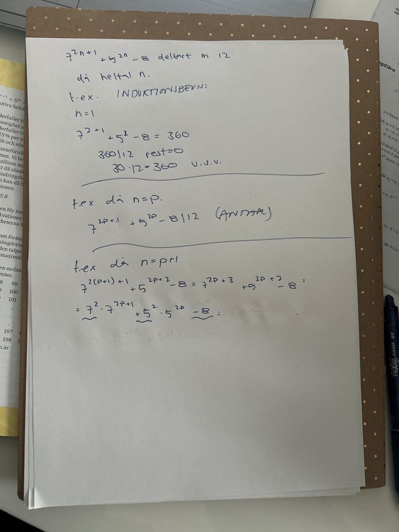 hej jag ska visa att 7^(2n+1) + 5^(2n) - 8 är delbart med 12 för alla positiva heltal n. Jag kommer tyvärr inte längre än så här, tacksam för hjälp!