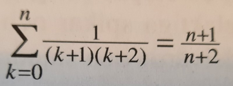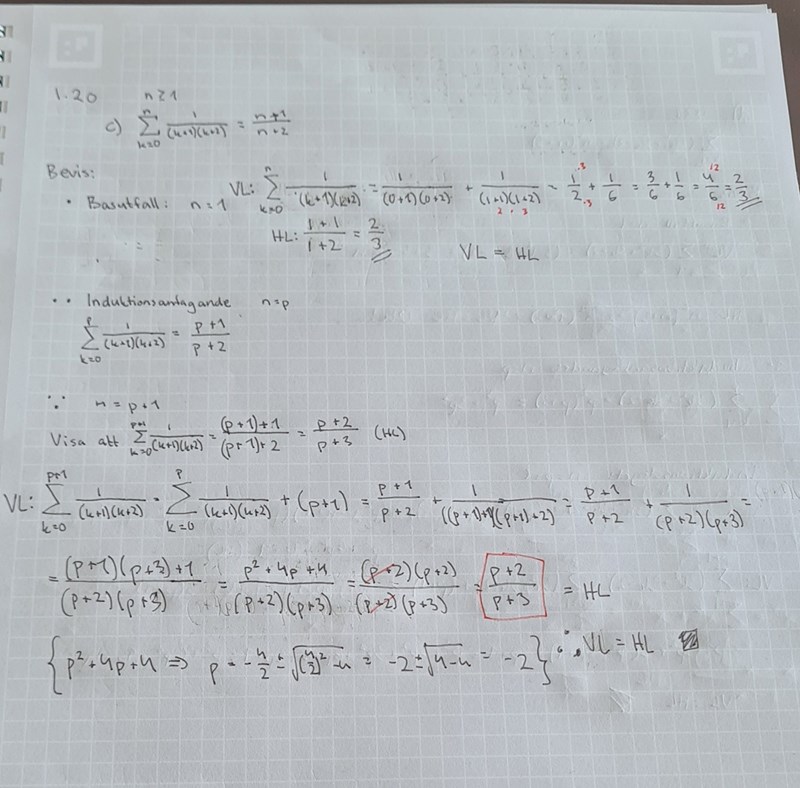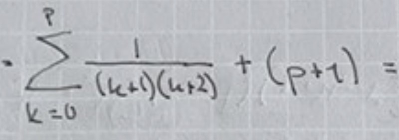 Det ska istället stå k=0p1(k+1)(k+2)+1((p+1)+1)((p+1)+2)\sum_{k=0}^{p}\frac{1}{(k+1)(k+2)}+\frac{1}{((p+1)+1)((p+1)+2)}