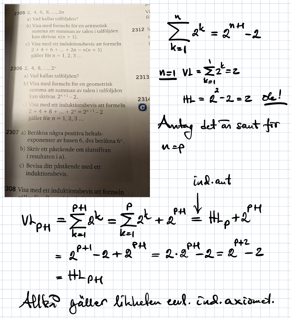 Jag kör formeln för summa för n = p, sen adderar jag talet n= (p+1) på summan, som då ska vara lika som summaformeln för n = (p+1). Grejar det icke, har gjort om det.. x antal gånger.