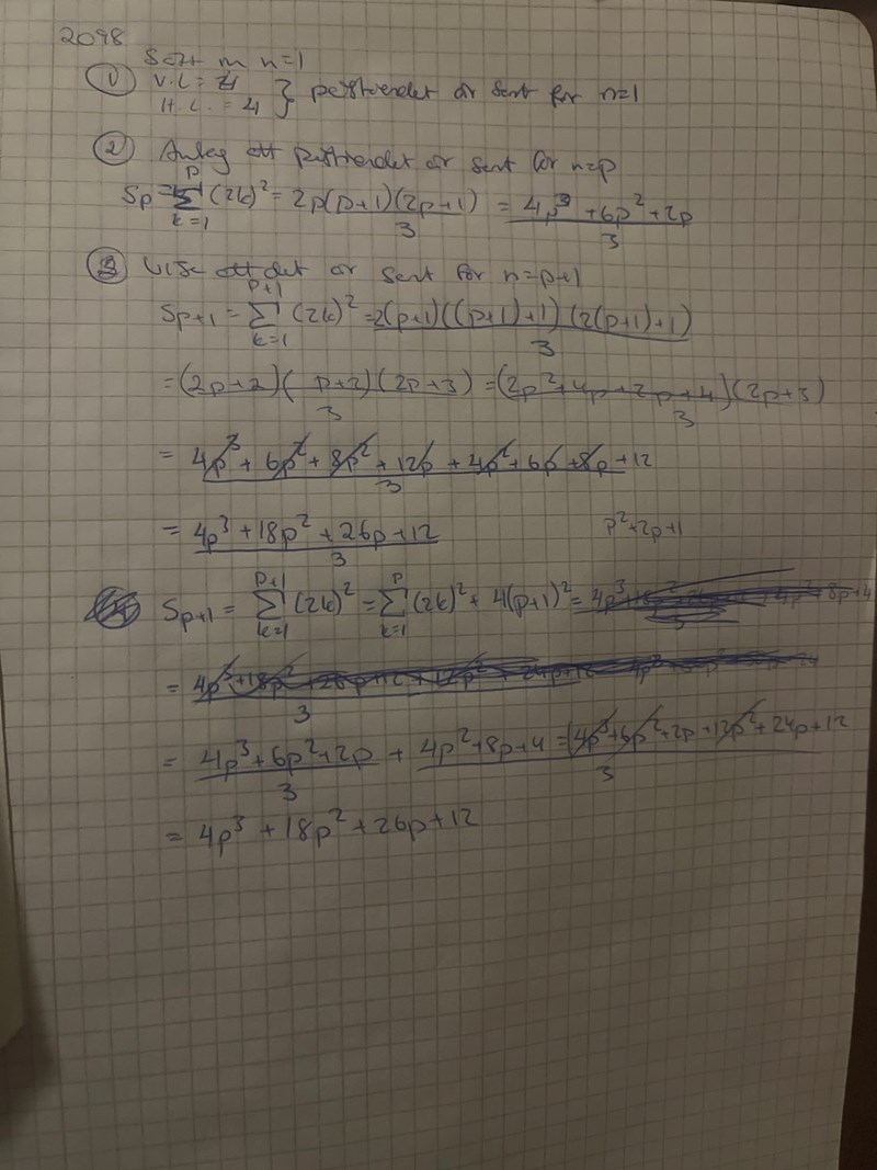 Hej, när man gör ett induktionsbevis är det smartare att behålla parenteserna eller att multiplicera in alla faktorer. T.ex i boken har de skrivit svaret med parenteser medan jag har muliplicerat in allting. Om ni inte förstår vad jag menar kolla på bilderna nedan. (Min lösning är kladdig) 2098