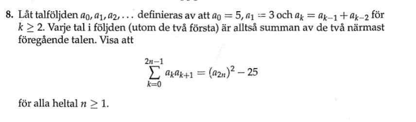 Jag har följande problem, försökte lösa det men har ingen aning hur man gör då man jobbar med index istället för normala tal. Dessutom står det i induktionssteget att man ska addera a2p * a2p+1 + a2p+1 * a2p+2 vilket jag har ingen aning var det kom från. Jag fick bara att man ska lägga till ap+1 * ap+2