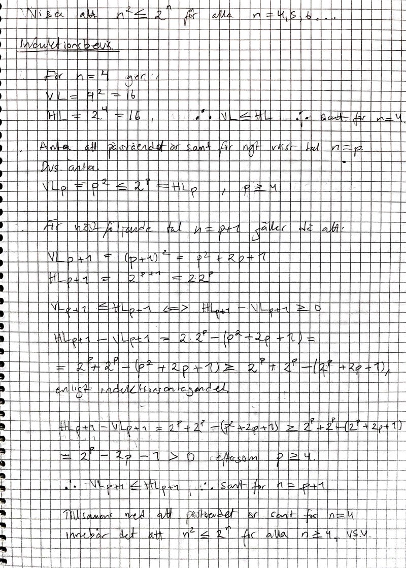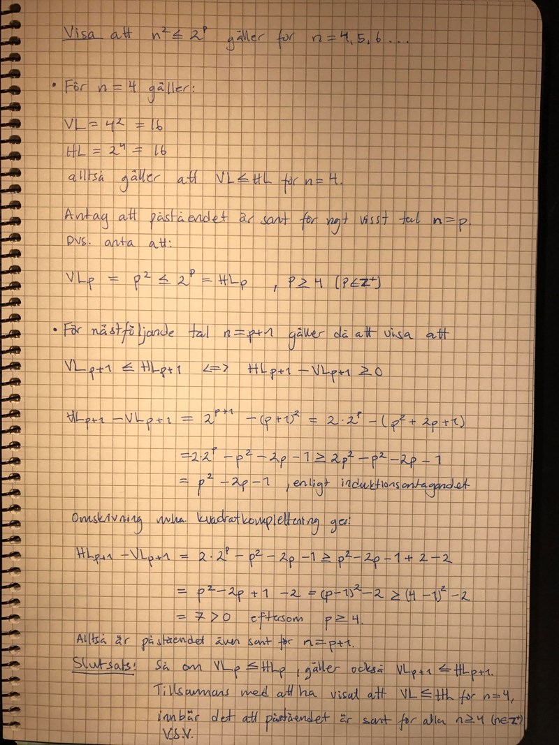 Tack för svar! Sorry ser att jag blandat ihop! Jag "bevisar" helt enkelt: HL(p+1) - VL(p+1) >= 0 och inte VL(p+1) - HL(p+1). Beviset går ut på att man ska visa att gäller för n = 4,5, 6,.....Du nämnde: "Om något är > 0 så är det automatiskt större än eller lika med.." - Då måste det väl betyda att mitt bevis är riktigt? :D eller? Facit gör det på ett lite mer annorlunda sätt och utnyttjar att: