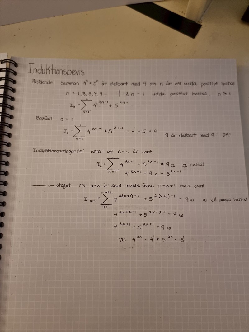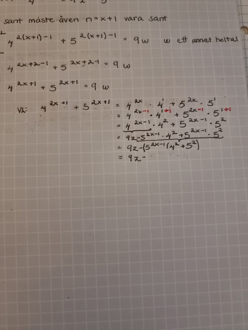 Jag ska visa att summan 4^n+5^n är delbart med 9 om n är ett udda tal. Jag fastnar i induktionssteget för jag ville sätta in 4^2x-1 som jag löste ut i antagandet men det blir inte bra. Har jag gjort fel? Hur ska man lösa denna?