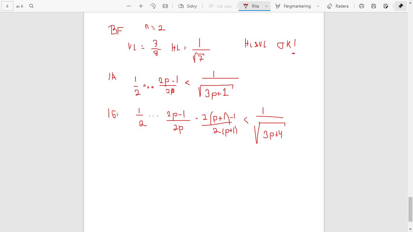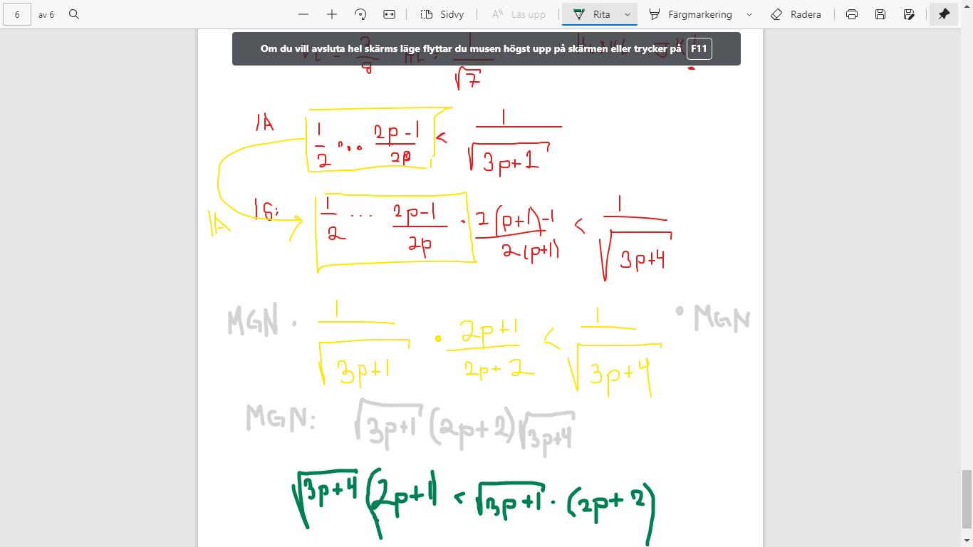 Om du multiplicerar IA med 2(p+1)-12(p+1)\frac{2(p+1)-1}{2(p+1)} så får du ett vänsterled som är lika med det på sista raden, och om högerledet är mindre än högerledet på sista raden så är du framme.