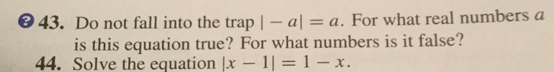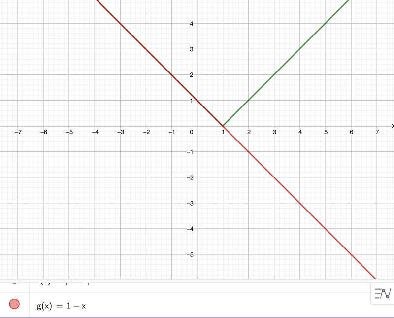 För vilka värden på x är 1-x = |x-1|? Det syns tydligt på bilden att den röda och den gröna linjen sammanfaller för alla värden . Jag förstår inte varför det skulle stå x<1 i facit, utan likhet.