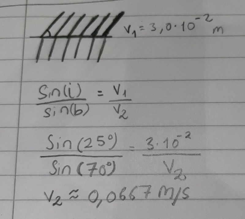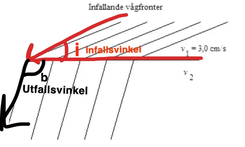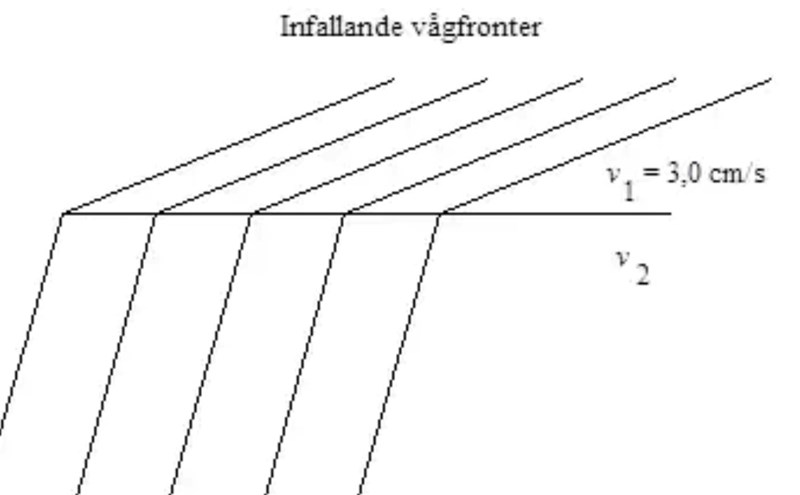 Nedanstående figur föreställer infallande vattenvågor med våghastighet v1, som närmar sig ett område med en annan våghastighet, v2. Figuren är i naturlig storlek och kan utnyttjas för mätningar.