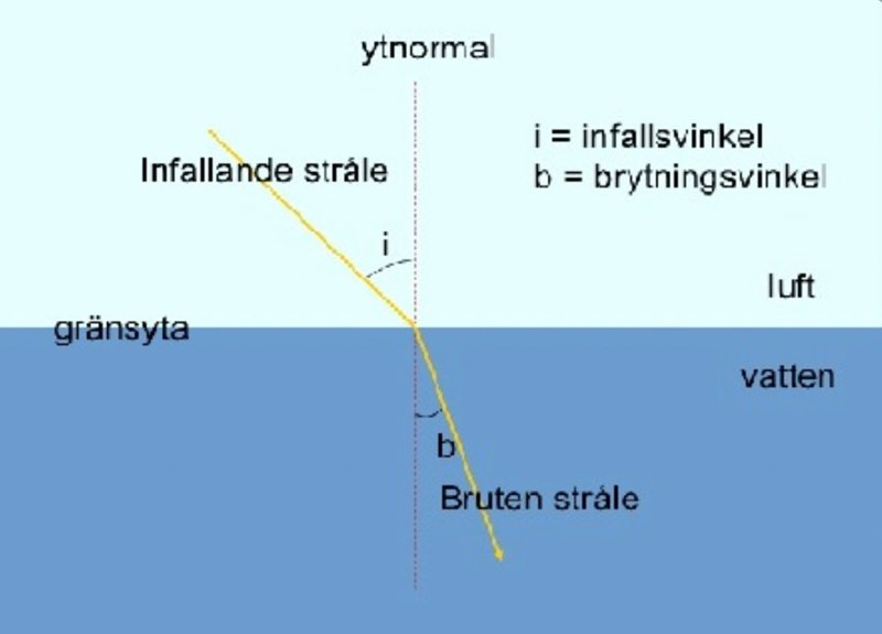 Bestäm infallsvinkeln och brytningsvinkeln.