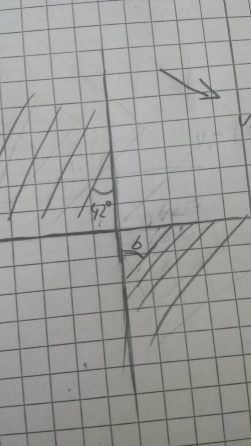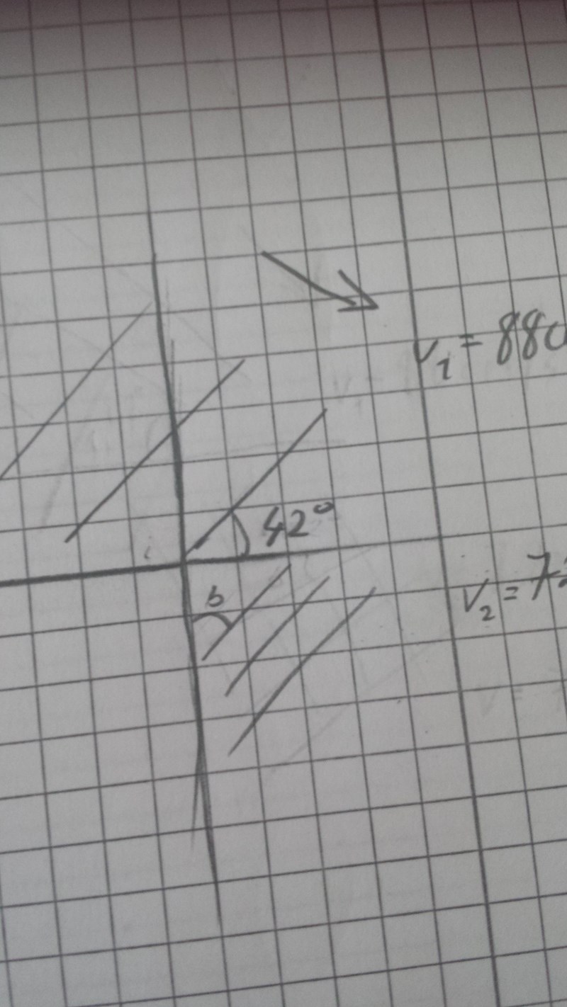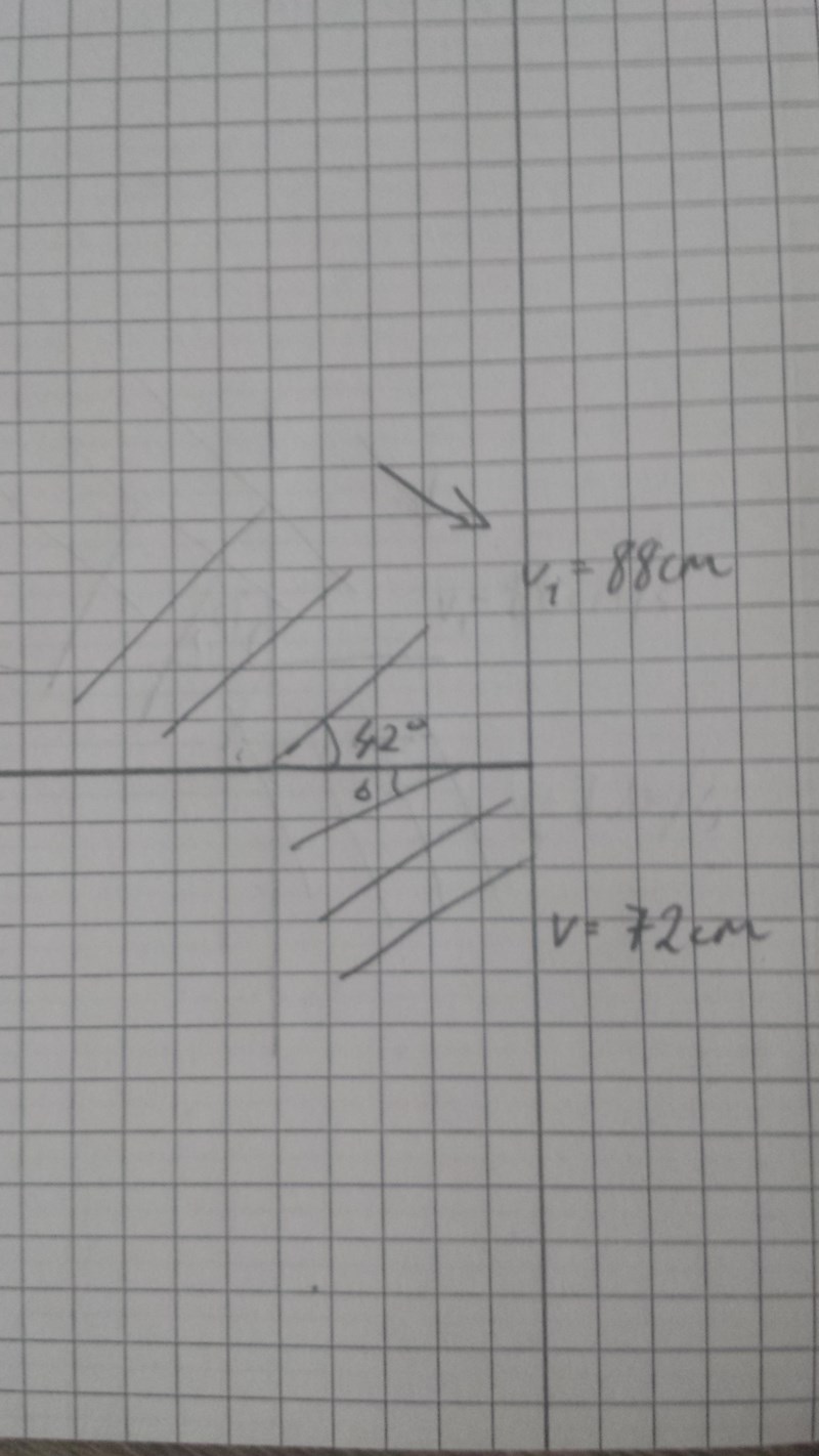 "Vattenvågor som går från djupt vatten till grunt vatten infaller mot den raka gränslinjen mellan de båda områdena under infallsvinkeln 42. Beräkna brytningsvinkeln då man vet att våghastigheten minskar från 88 cm/s till 72 cm/s."