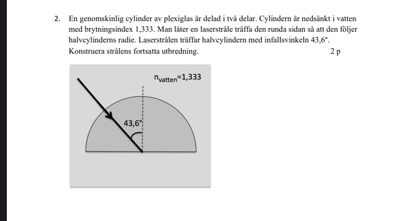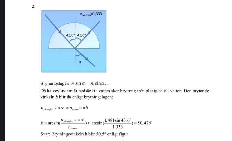 hej, varför har facit ritat en ljusstråle som åker ut från prismat med vinkeln 43,6 grader? Det ser ut som att en totalreflexion på 43,6 grader har ägt rum på bilden