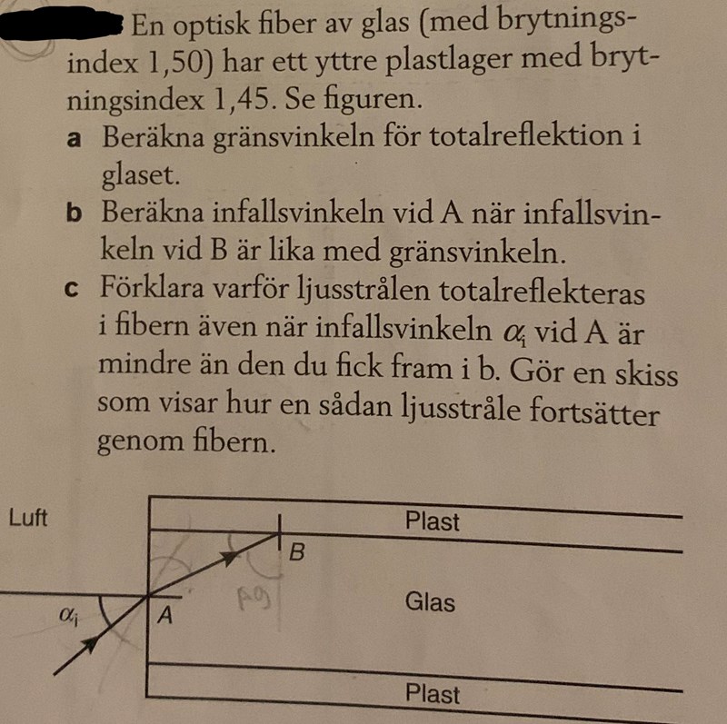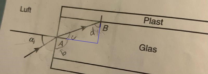 Sen får du sätta upp sambandet för sin(c), sin(αi) och brytningsindexen så kan du räkna ut den vinkel αi som precis resulterar i reflektion i punkten B.