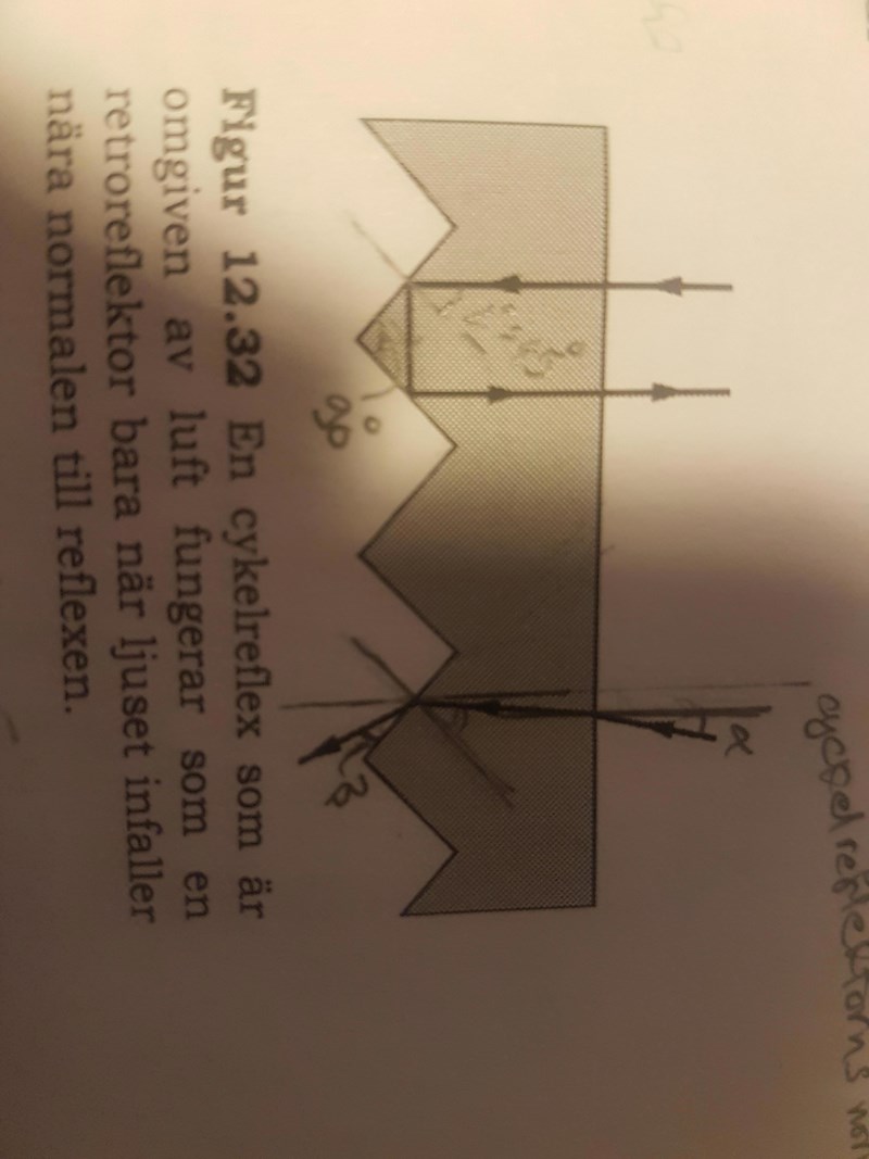 För vilka infallsvinklar (i förhållande till cykelreflektorns normal) ger den typen av sned stråle upphov till totalreflektion i baksidan?