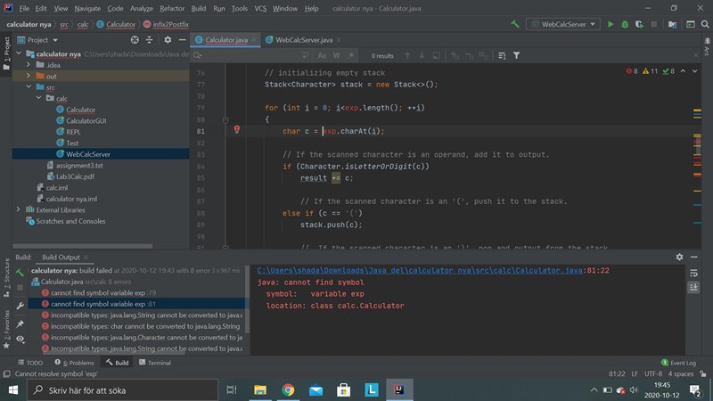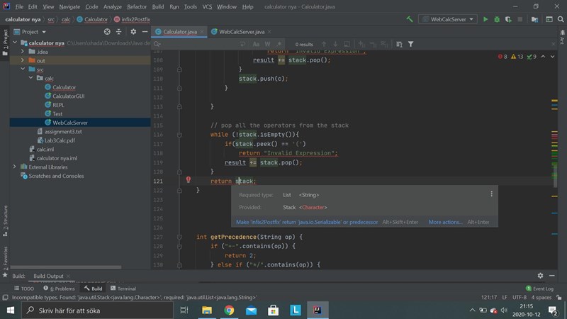 Jag har gjort infix2postfix metoden och tokenize metoden.