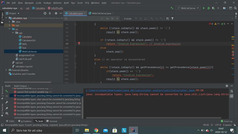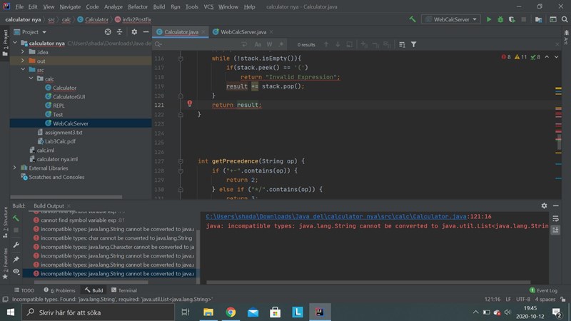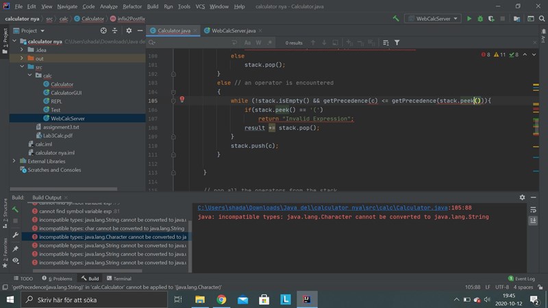 Nu har jag bytt koden ännu en gång, även nu fungerar den inte. Dess inmatning ska vara ett infixutryck och det skall ge ut ett postfixutryck. Om infixutrycket är t.ex "1+3" så ska koden göra det till "13+". Det den gör just nu är ingenting, den ger ett error message.