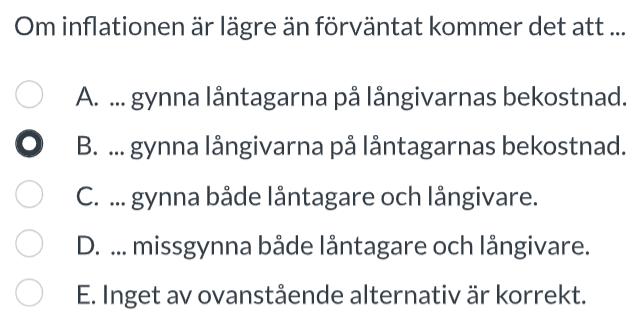 Varför gynnas långivarna på låntagarnas bekostnad om inflationen blir lägre än väntat? Jag tänker att om inflationen minskar kommer långivarna få sämre räntor och därmed minska marginalen på sina lån. Dessvärre kommer låntagare kunna ta lån billigare än om inflationen varit högre än väntat.